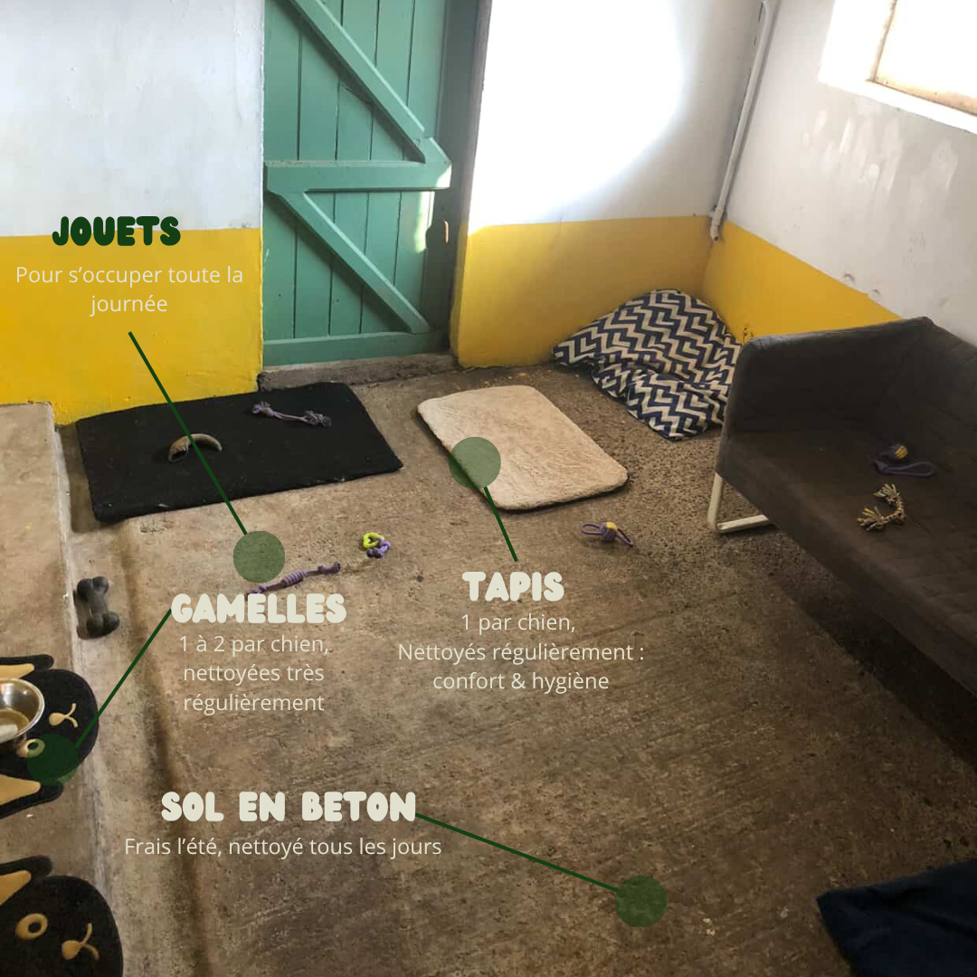 À Nivillac, vos chiens seront accueillis dans un cadre champêtre et familial, au cœur d’une ancienne ferme en rénovation. L’ancienne étable a été transformée en un petit chenil confortable, prévu pour accueillir jusqu’à 8 chiens – un nombre volontairement limité pour conserver une ambiance calme et chaleureuse. J’habiterai juste à côté, dans la maison attenante, afin d’être présente en permanence. Le chenil est composé de quatre box de 10-12 m², chauffés en hiver, dans lesquels les chiens seront répartis en fonction de leurs affinités (ou mésententes !). Chaque chien aura son propre tapis moelleux pour se reposer en toute tranquillité.